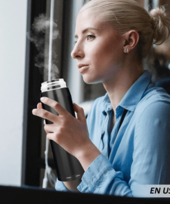 El termo posee aislamiento al vacío de forma ergonómica permite un funcionamiento con una sola mano al soltar y presionar brevemente el botón lateral, se adapta a la mayoría de los portavasos.